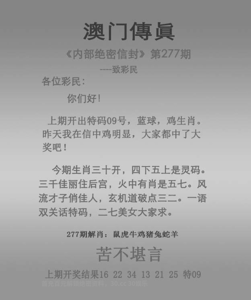 传真277期 今期生肖三十开,四下五上是灵码。 三千佳丽住后宫,火中有肖是五七。 风流才子俏佳人,玄机道破点三二。 一语双关话特码,二七美女大家求。 苦不堪言 解:今期三千佳丽住后宫,解吉美生肖兔龙蛇马羊鸡,火中有肖是五七,解火肖蛇马 综合:猴虎兔蛇狗猪鸡马羊 |